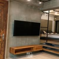 電視牆延伸至架高的臥室區,透過黑鐵架構劃分界線,讓視線與光影在開闊感中自由流動。