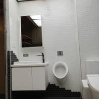 我們打破了工業風沉悶的刻板印象,利用黑白六角磚的幾何拼接,