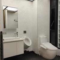 在牆面勾勒出不規則的律動;搭配玻璃磚引進微光,讓原本硬朗的空間多了一份通透的呼吸感。